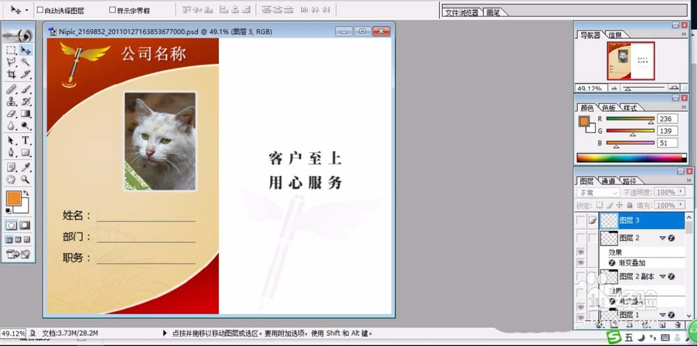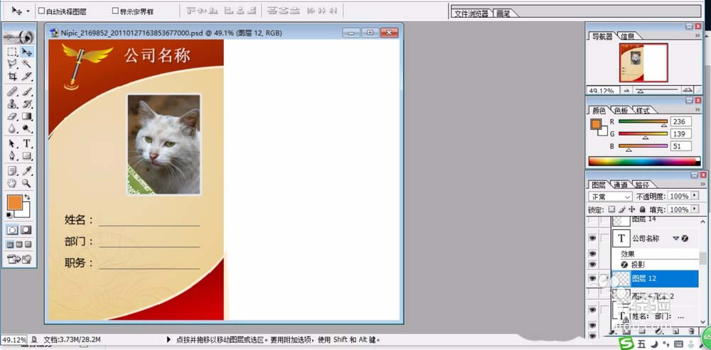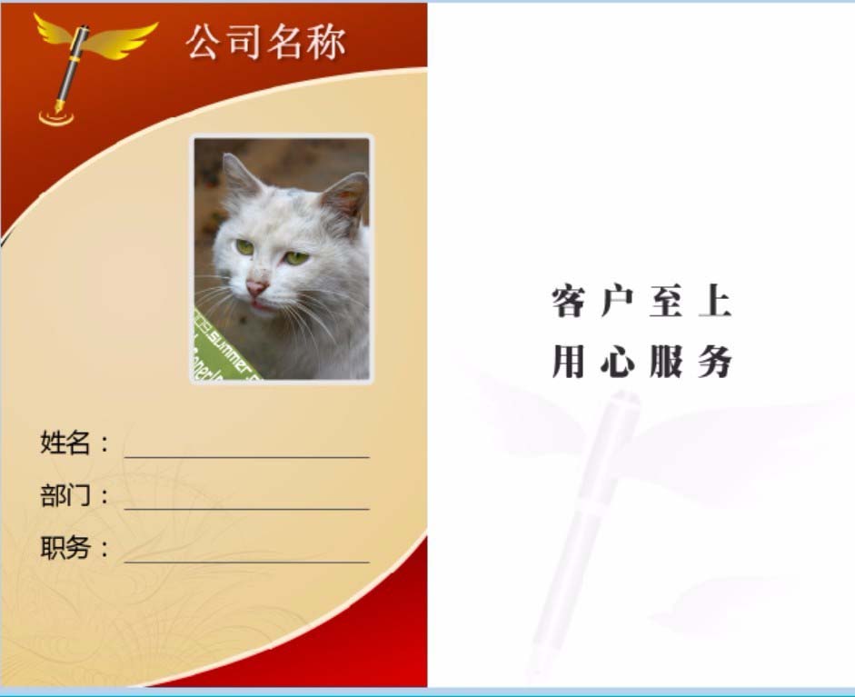 6、导入一张无背景的钢笔图片作为员工卡左上方的装饰物,继续打出员工卡右侧的文字,我们放大后调整到合适的位置。