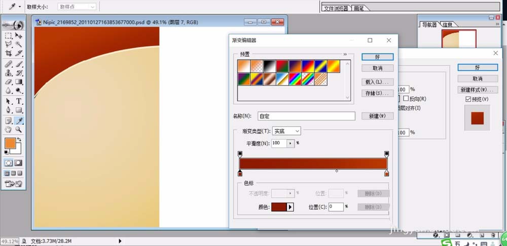 2、继续用钢笔画出员工卡的左侧上方的标题区域路径,先设置图层为渐变叠加效果,我们用暗红色的渐变填充。复制一下路径,调整成为阴影路径,我们用较亮的土黄色来填充。