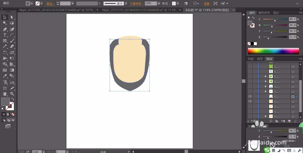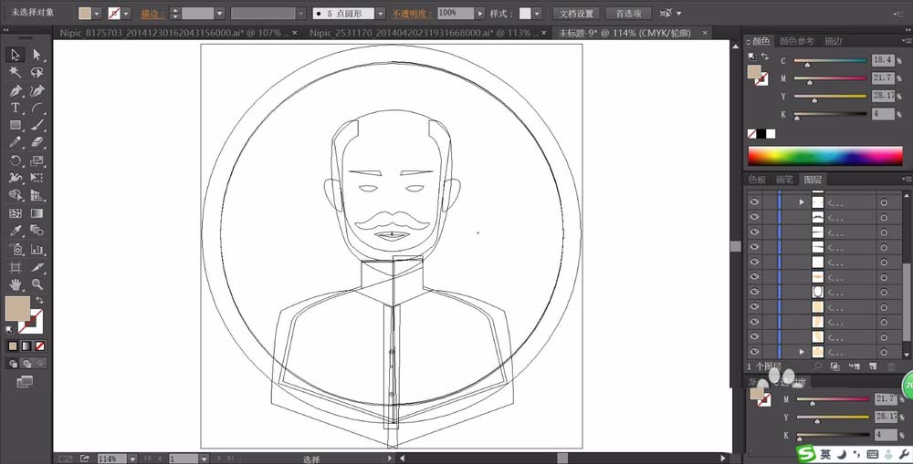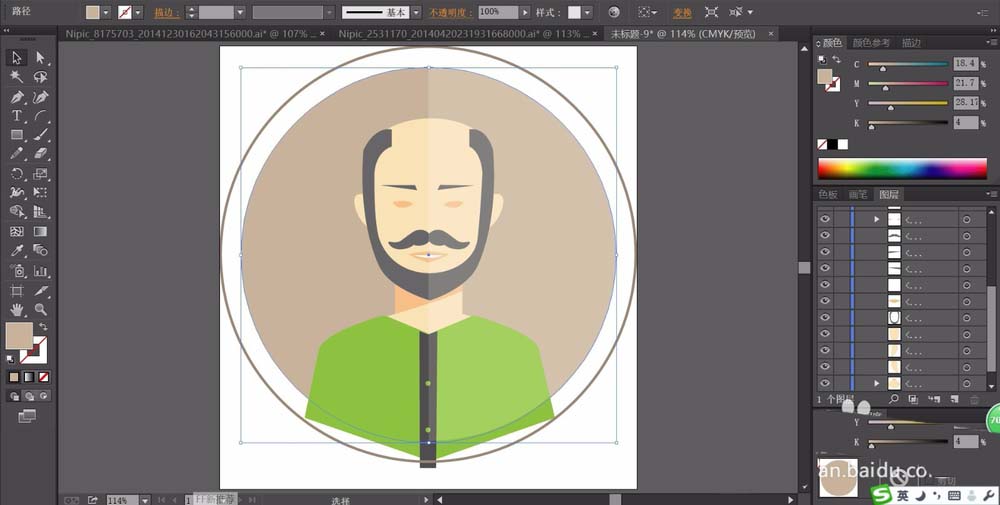 5、用钢笔画出大叔服饰中间的领带的路径,我们用灰黑色填充,使用圆形画出一个大叔的圆形背景,我们用棕色来进行描边。