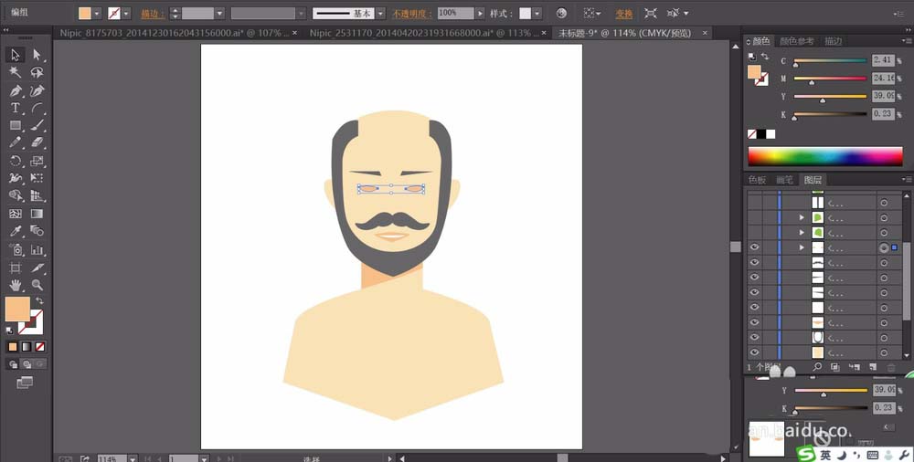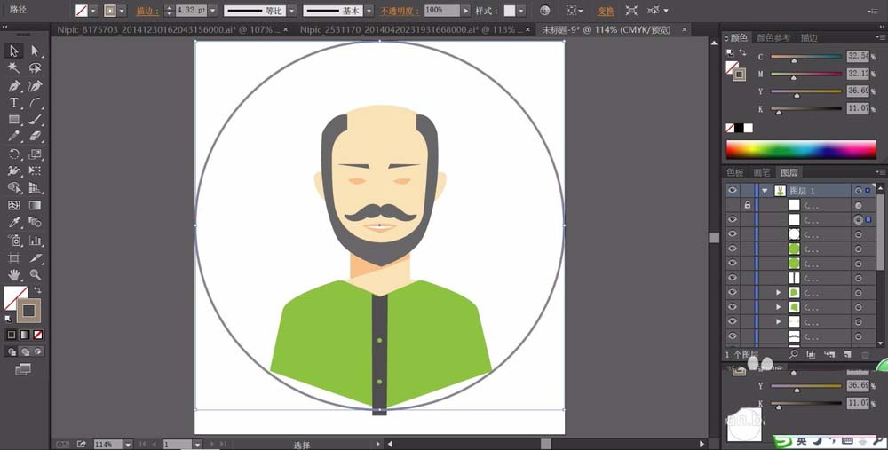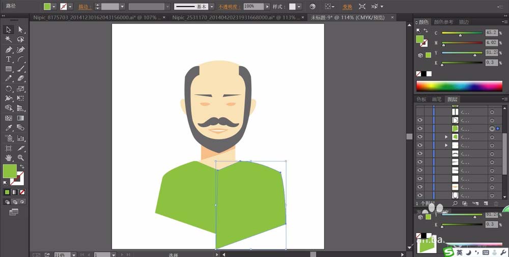 ai这几矢量图形很简单,想要画一画秃顶的大叔形象,从中学习一下画不同年龄的人的技巧,再体会一下绿色与土黄色的搭配应用技巧,该怎么绘制呢?下面我们就来看看详细的教程。