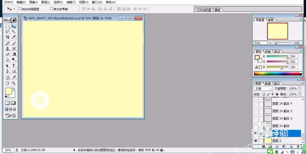 1、用淡黄色填充图片的背景,再用圆形画出背景上面的图案的选区,我们设置成羽化的效果,再用白色来填充,从而呈现一个半透明的白色光斑。