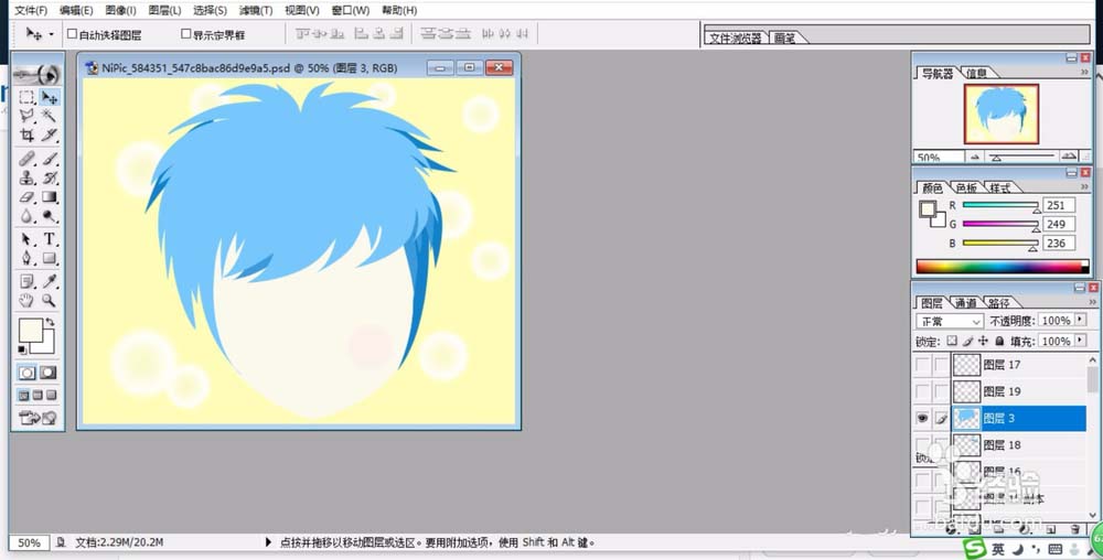 4、继续用钢笔画出男孩的浅色区域的头发的路径,我们用天蓝色来填充这个浅色的头发区域。再用钢笔画出男孩的脸蛋的路径,我们用粉色填充这个男孩的脸蛋路径。