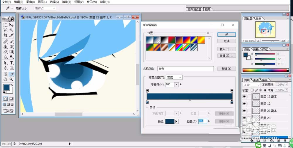 6、最后,我们用钢笔画出男孩的眼晴,我们用蓝黑色的渐变与蓝色的渐变填充眼晴的瞳孔与眼珠,用灰黑色填充男孩的眉毛与睫毛的路径。勾勒出男孩的鼻子与嘴巴的路径并用粉色的渐变填充,完成男生头像设计。
