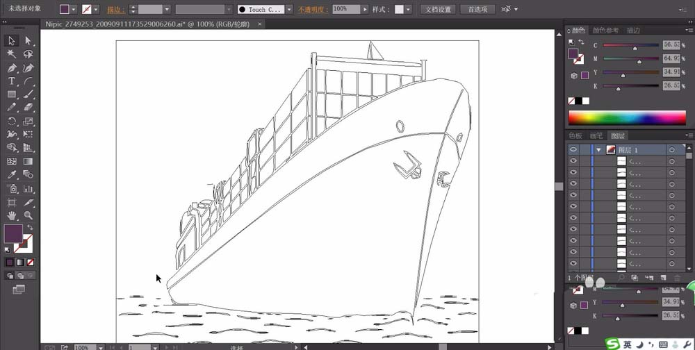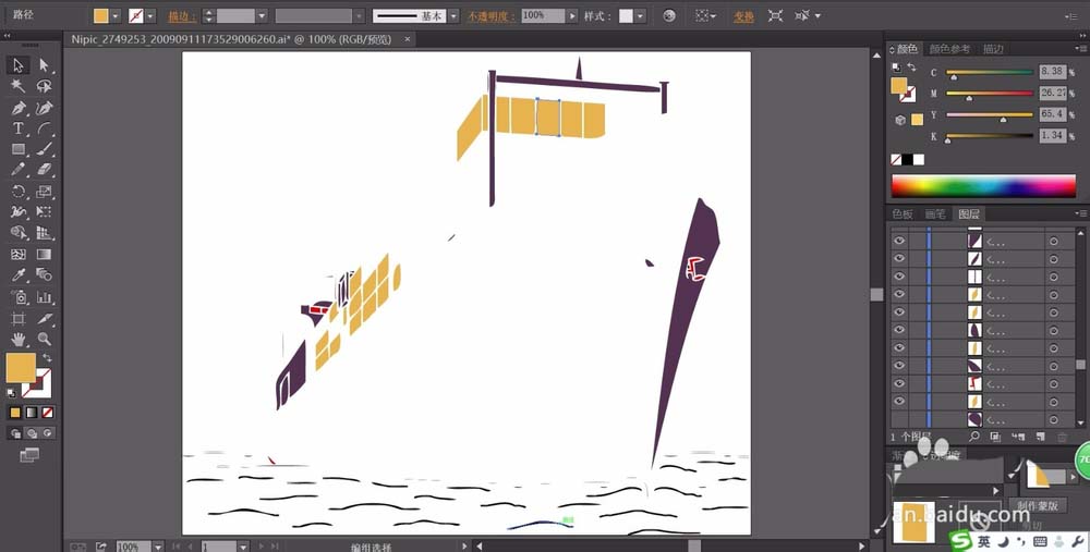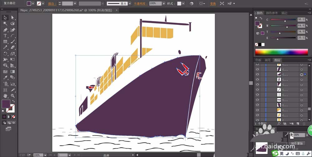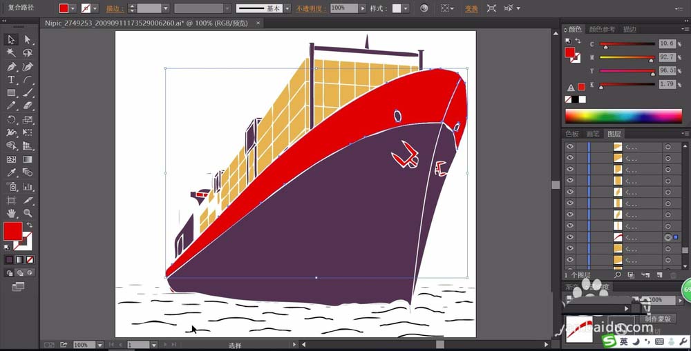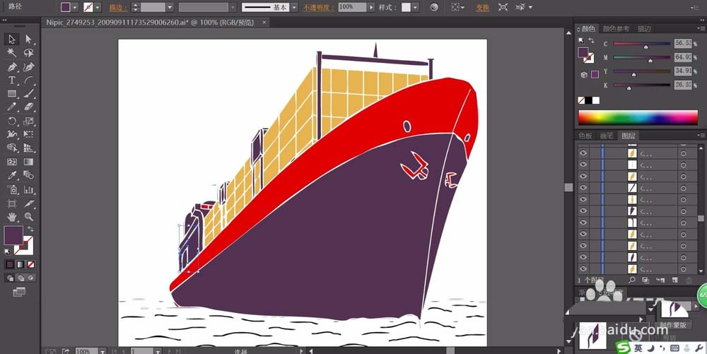 3、我们用土黄色填充集装箱的封闭路径,再用紫黑色填充船体的路径。