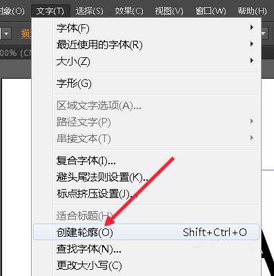 3、选择字母,改变填充颜色为红色,从菜单栏的文字菜单里选择创建轮廓,如图。