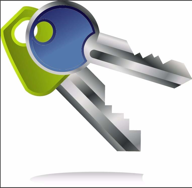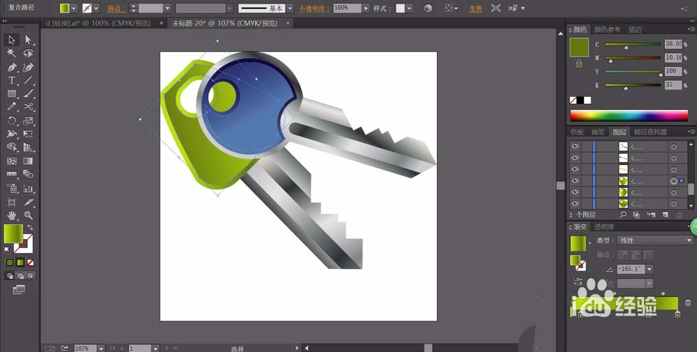 6、设置一个绿色的渐变色,我们用同样的办法绘制出一把绿色调的钥匙,分别用绿色的渐变填充钥匙的末端,用灰黑色的渐变填充钥匙的前端,完成钥匙图标设计。