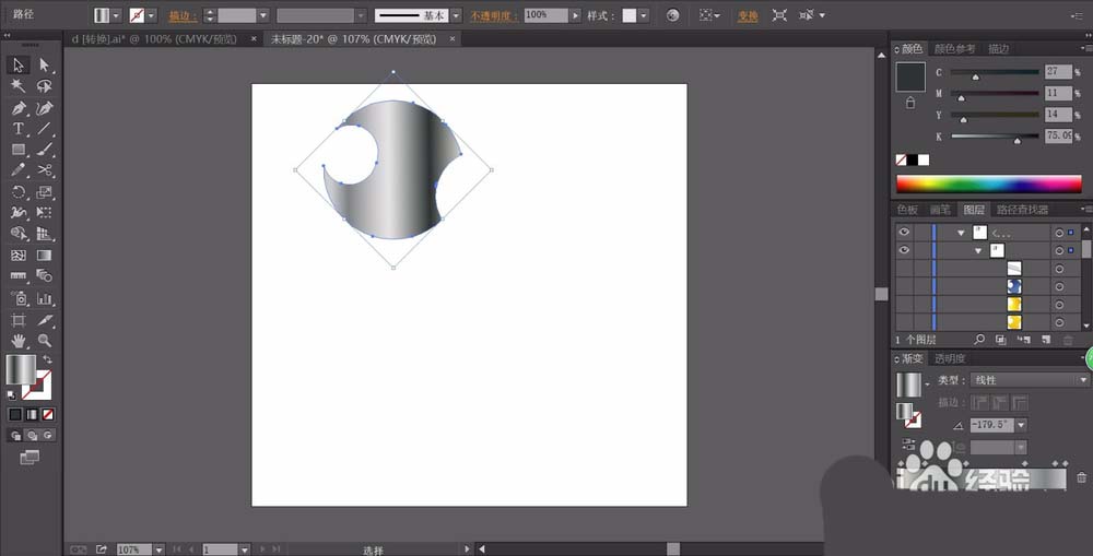 1、先用钢笔勾勒出钥匙的末端结构,我们用灰黑色的渐变色填充,注意渐变的角度,让高光出现在中间部分。