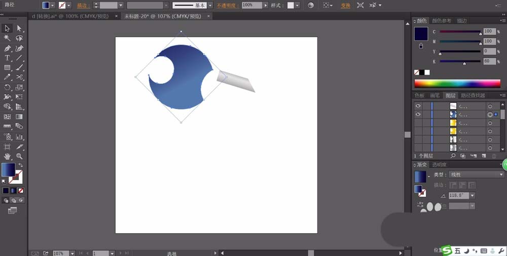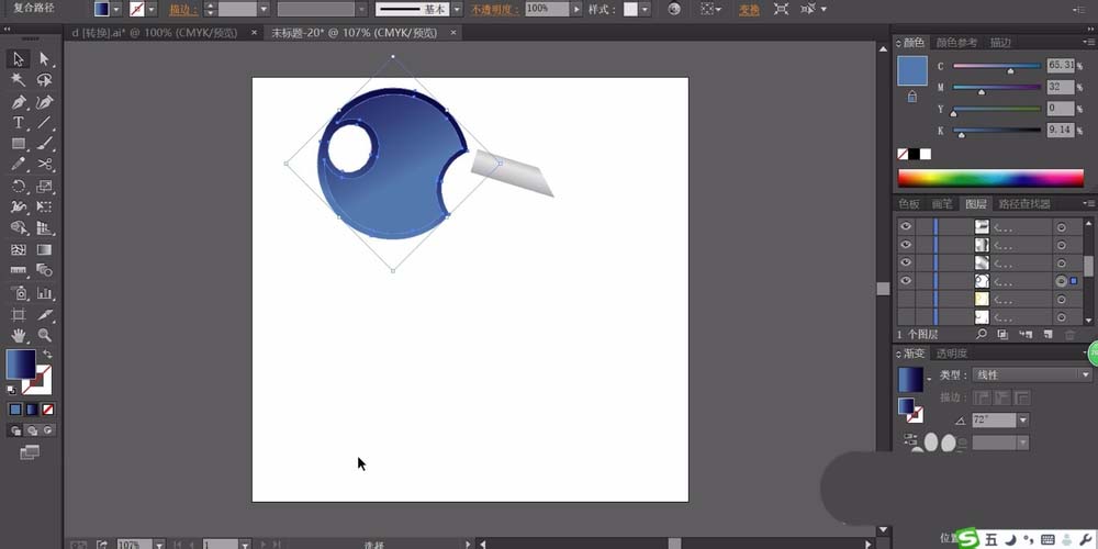 2、设置一个蓝黑色的渐变,我们复制一下路径并用蓝黑色的渐变色填充,再用钢笔开始绘制钥匙的前端路径,我们用灰色的渐变填充前端的高光区域。