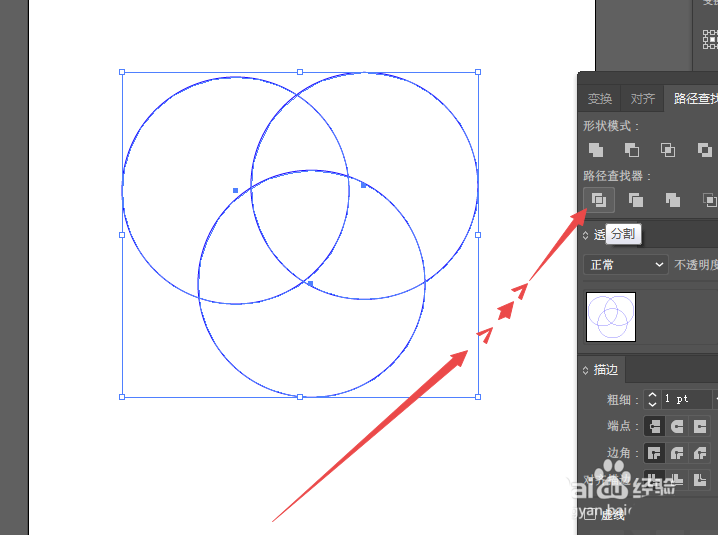 6、然后去掉辅助线,点击路径查找器下面的 分割 图标。