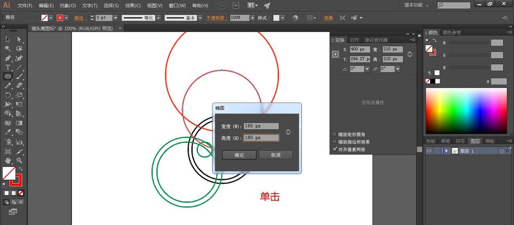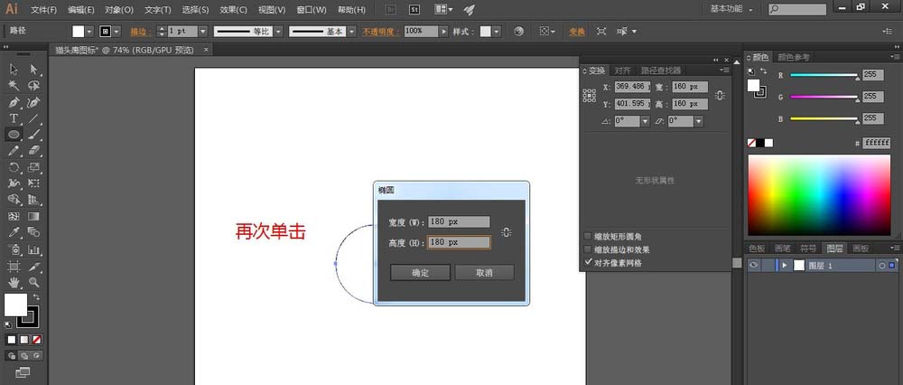 5、再次在画布空白处单击,创建180*180px的圆,如图所示。