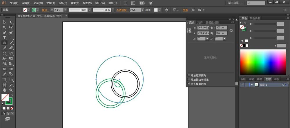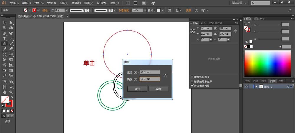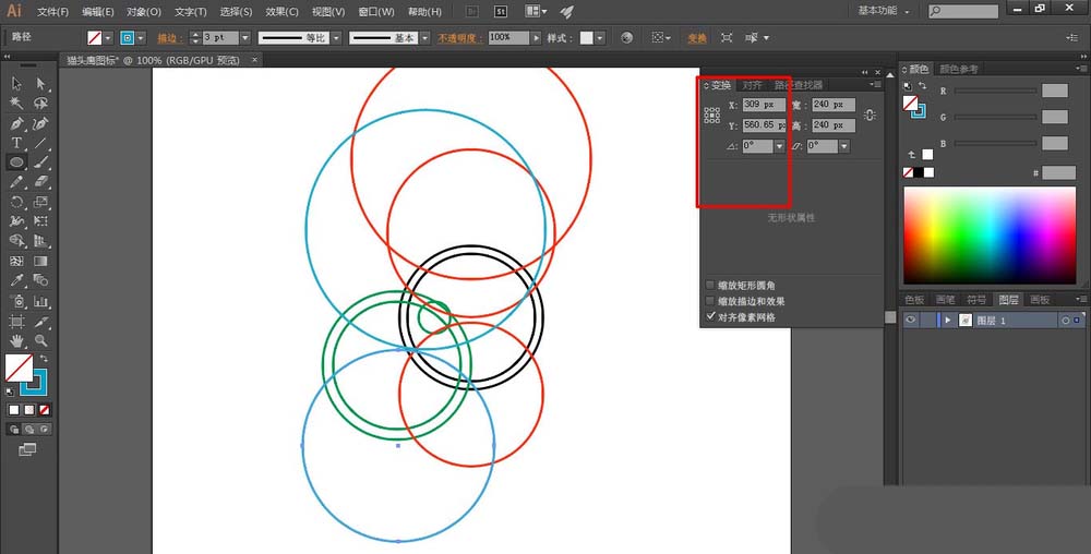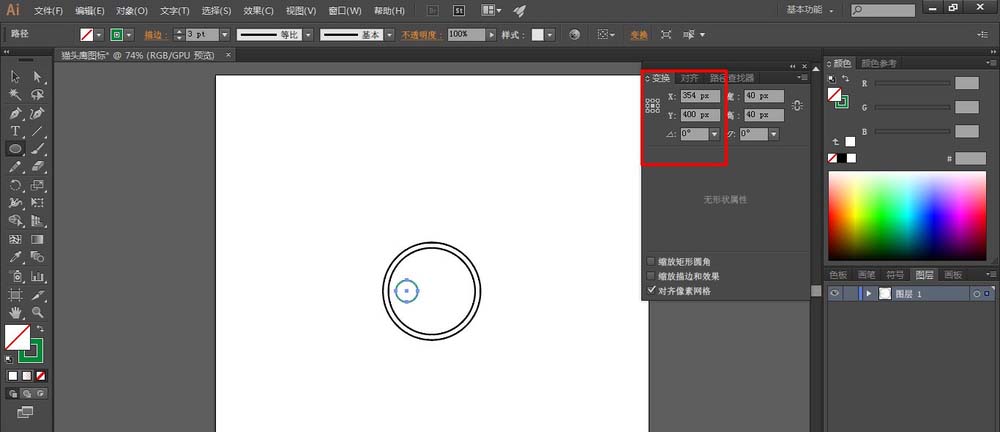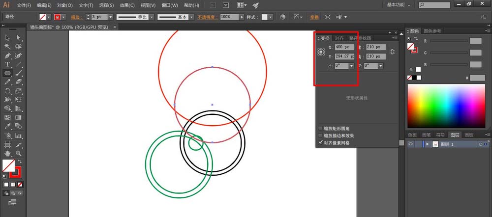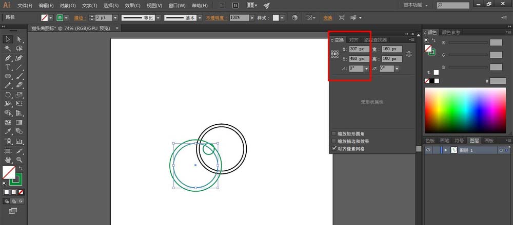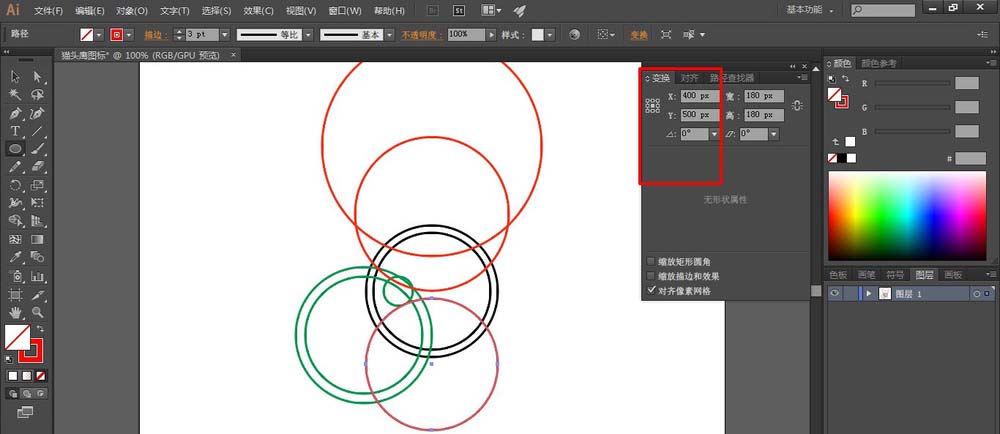 9、选中其中一个圆,修改右上角的变换面板,X:400px,Y:400px,如图所示。