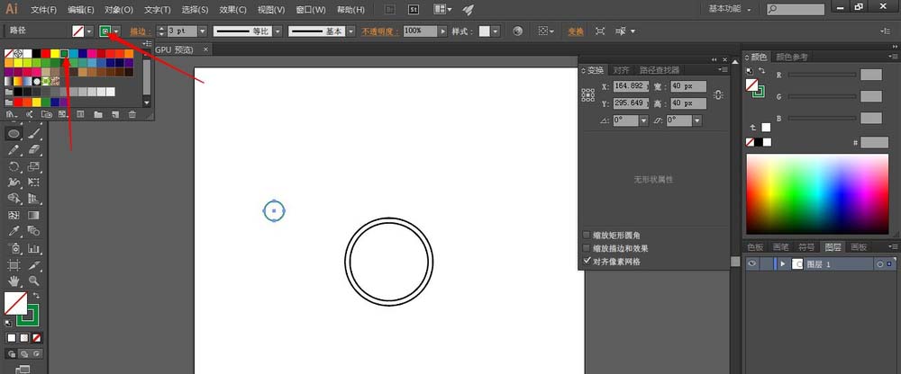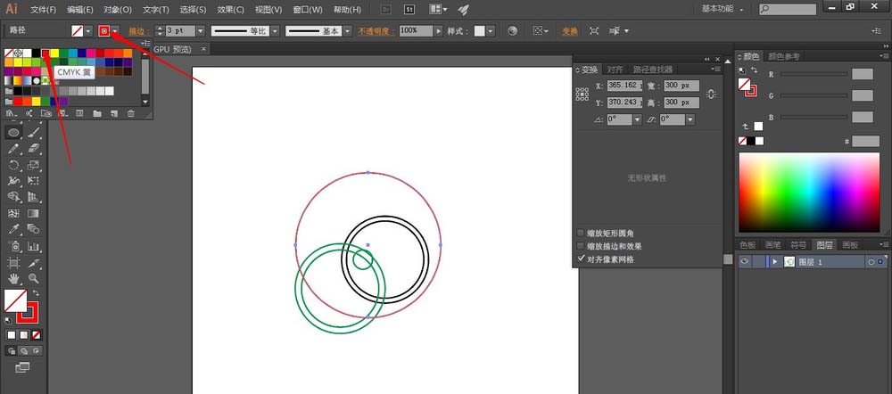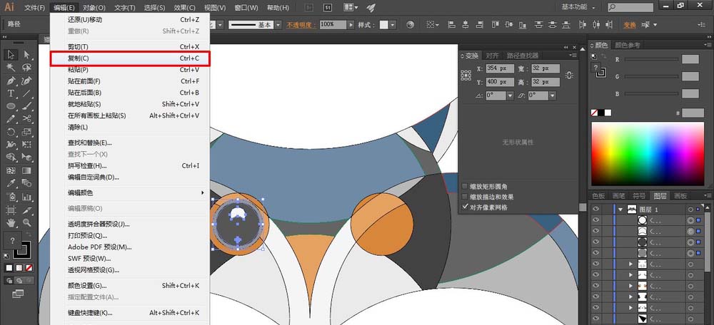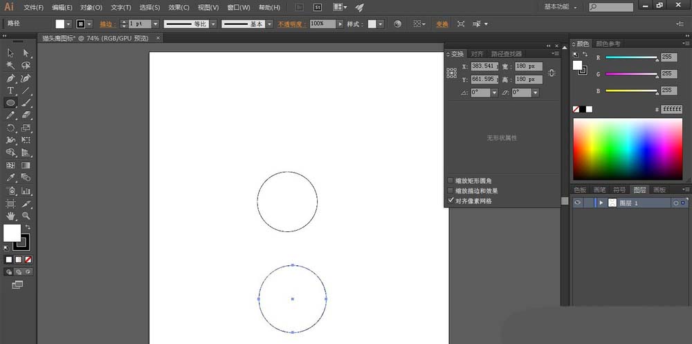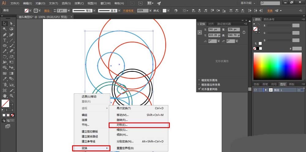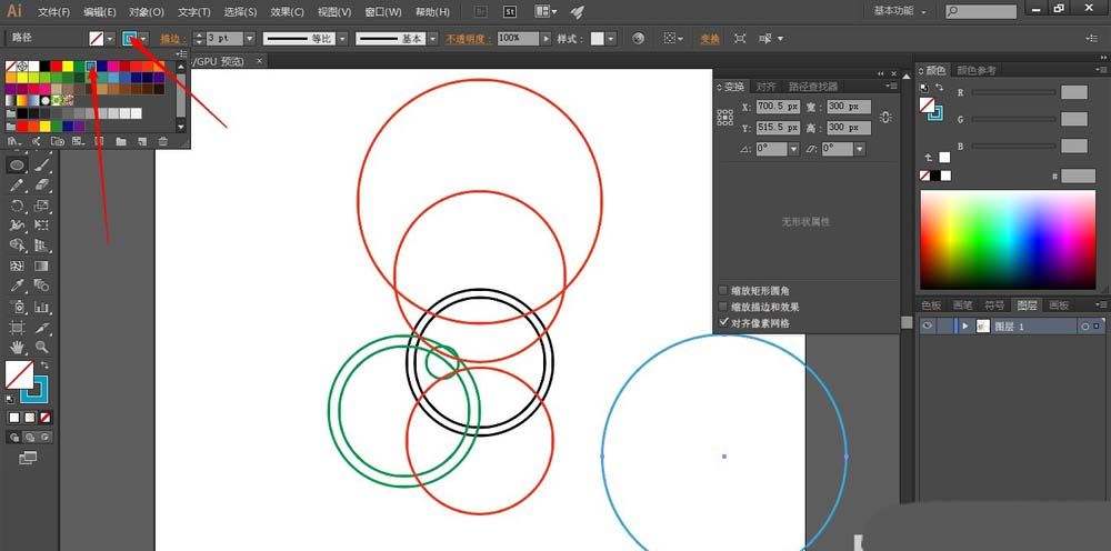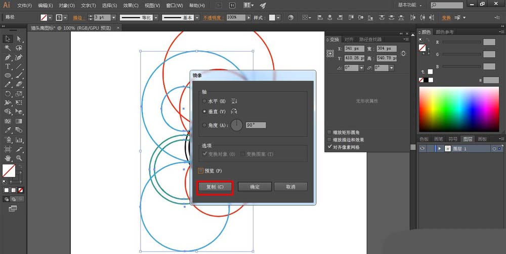 9、选中其中一个圆,修改右上角的变换面板,X:400px,Y:400px,如图所示。