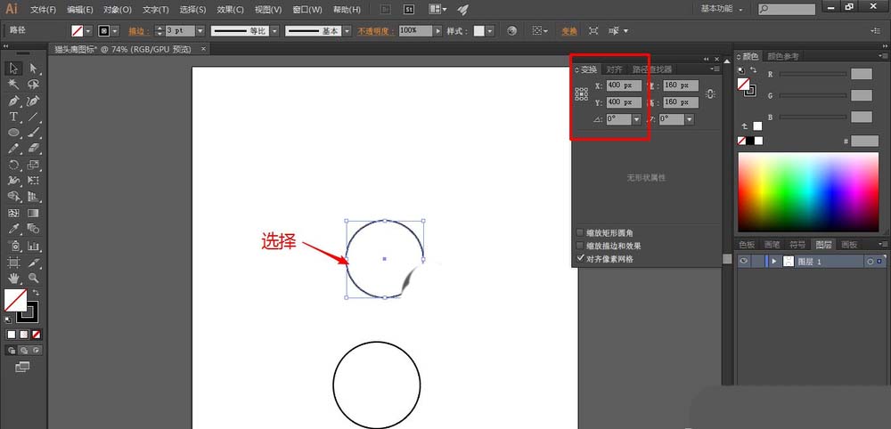 10、选中另一个圆,修改右上角的变换面板,X:400px,Y:400px,如图所示。