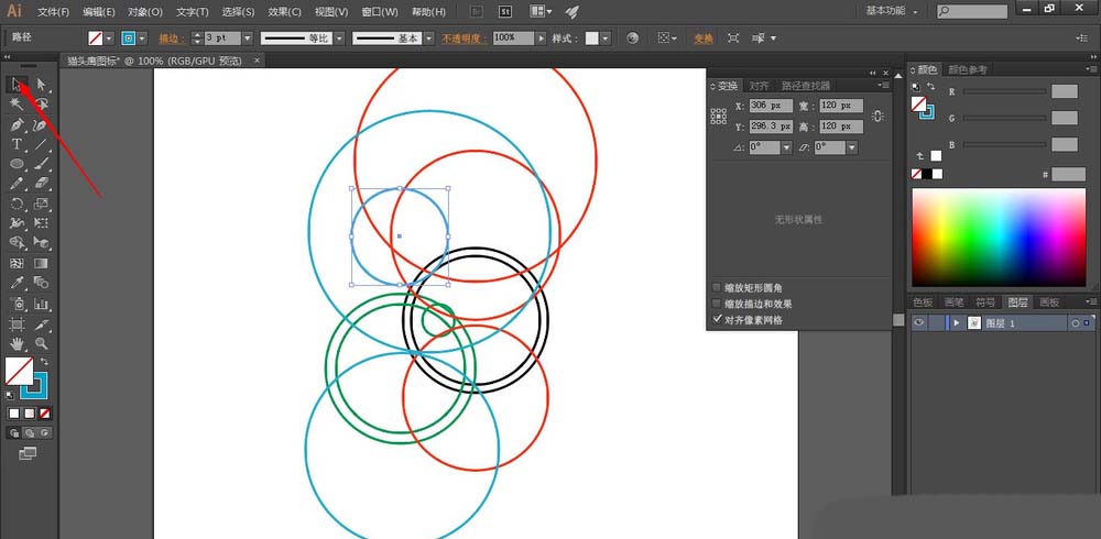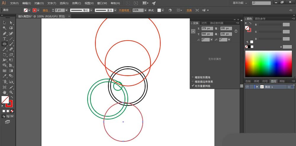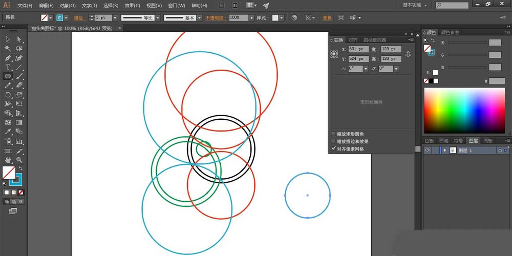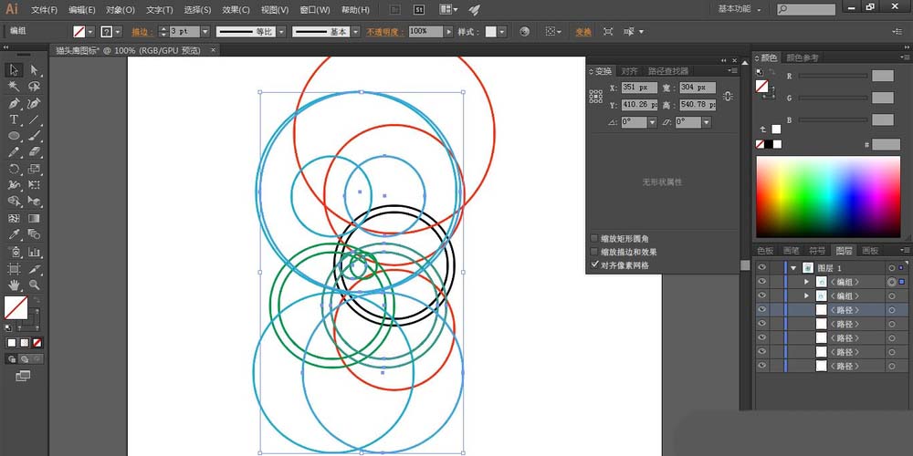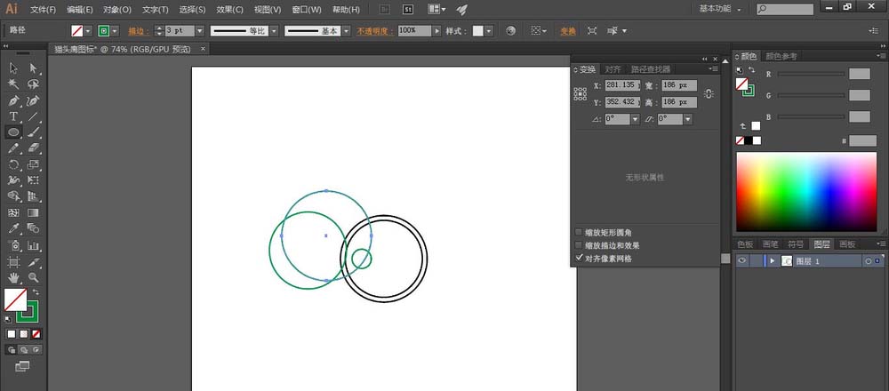 35、按住Shift键选中绿色和蓝色的圆,如图所示。