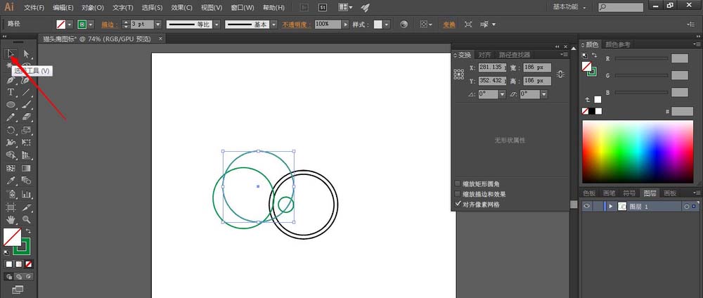 34、选择左侧工具栏的实心箭头图标(快捷键V),如图所示。