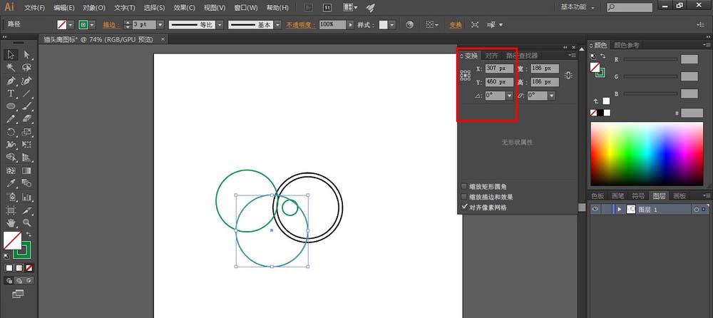 19、选中另一个绿色圆,修改右上角的变换面板,X:307px,Y:460px,如图所示。