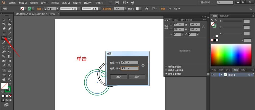 20、使用左侧工具栏椭圆工具(快捷键L),在画布空白处单击,创建300*300px的圆,如图所示。