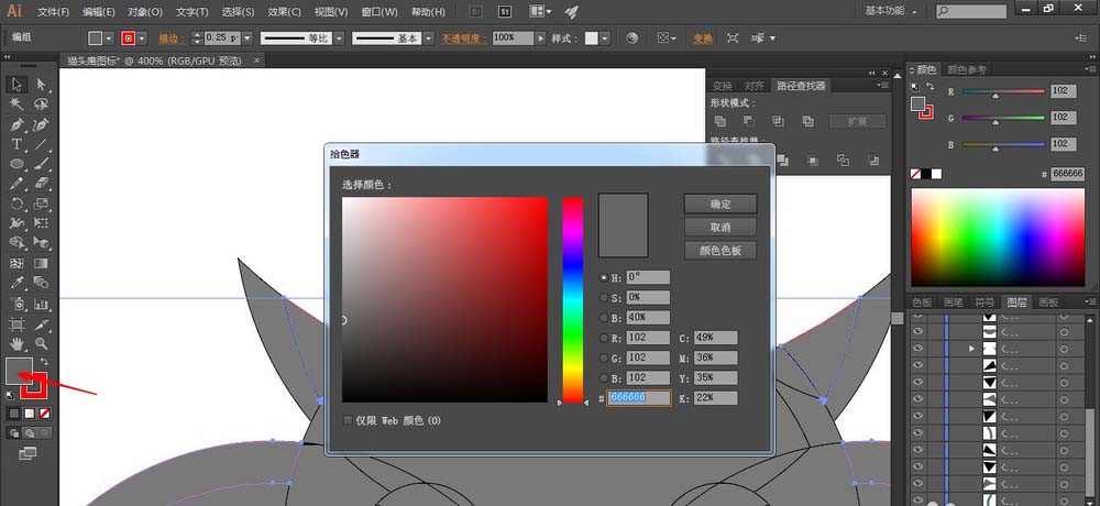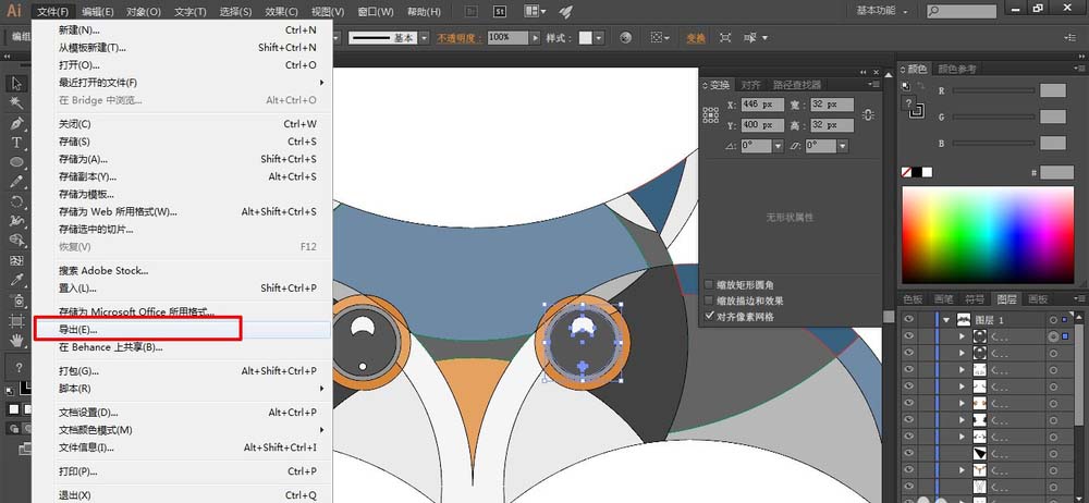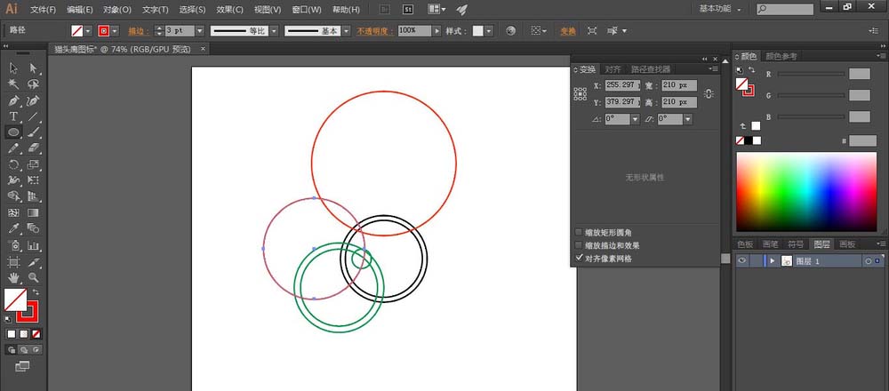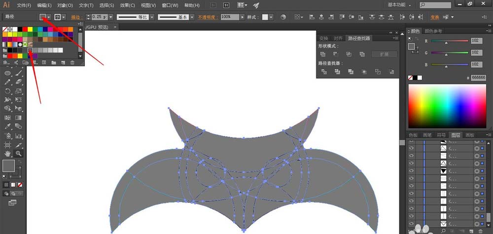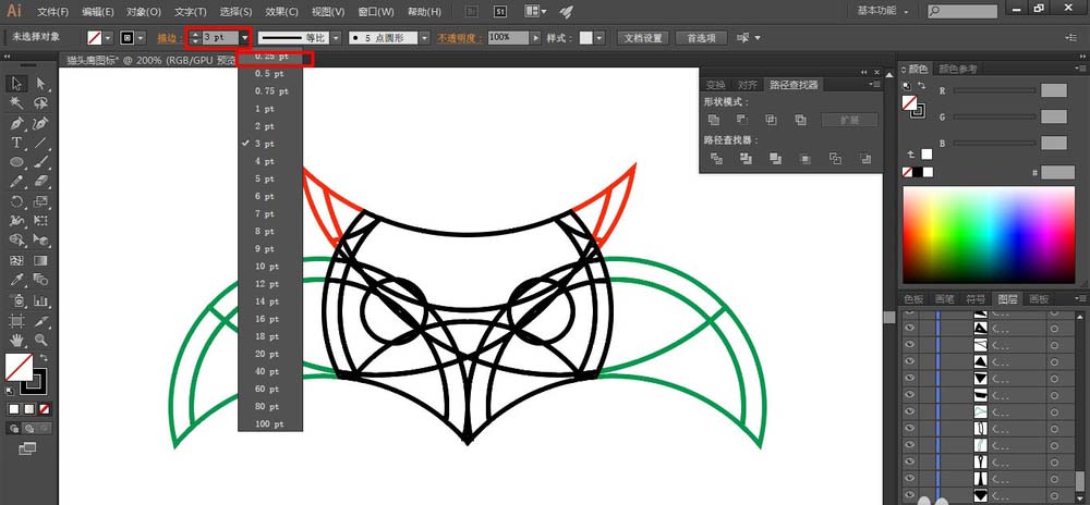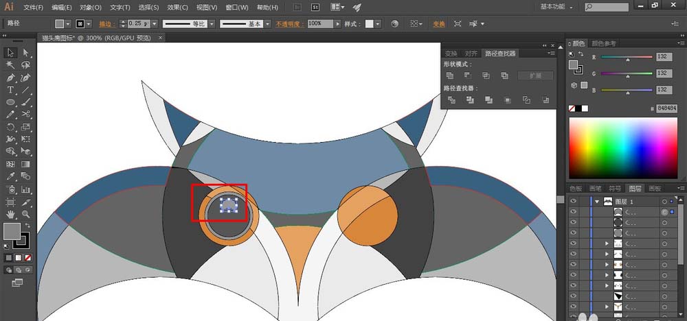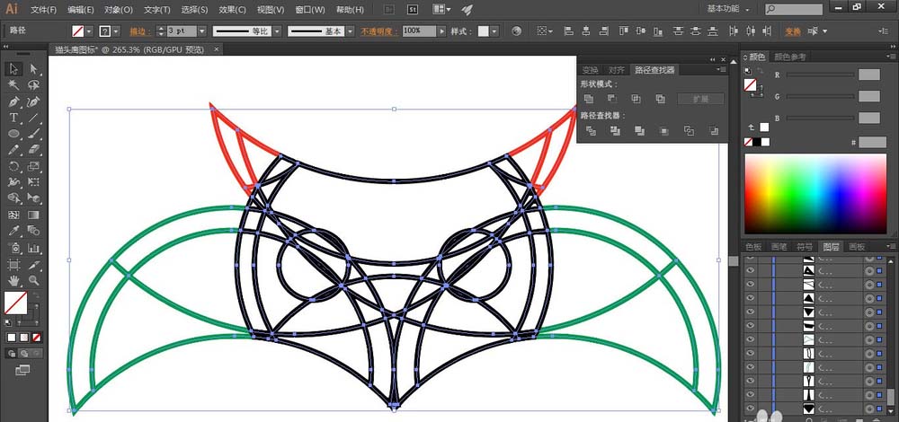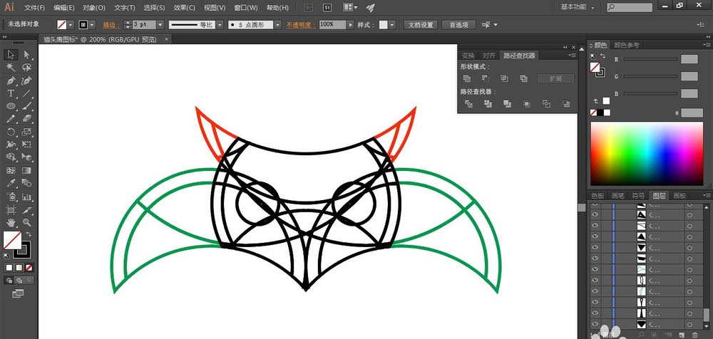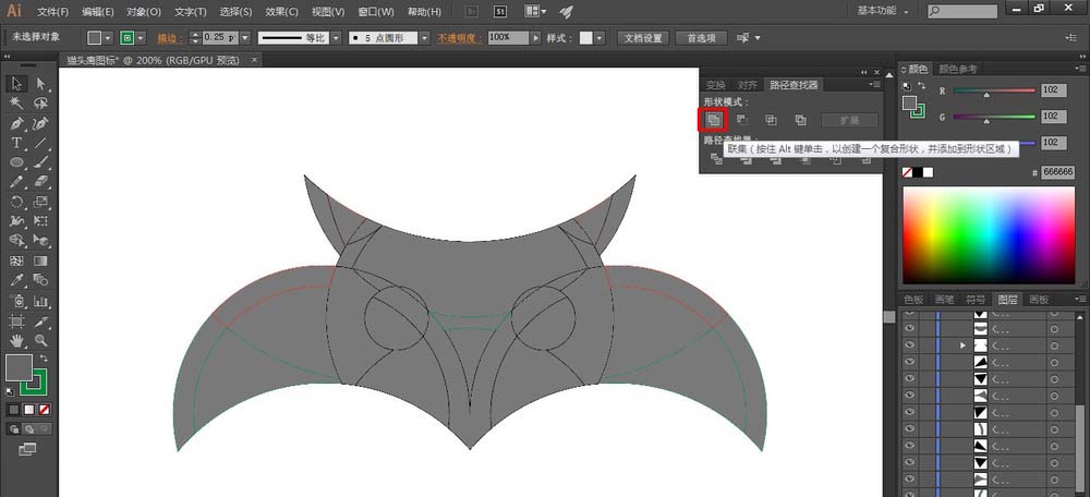 47、参照完成的图片,将同一颜色的路径在路径查找器面板中选择—联集,如图所示。