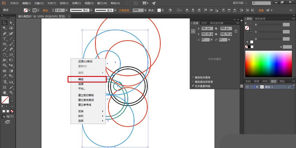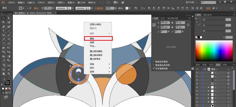 56、按住Shift键选中这几个路径,右键,选择编组,如图所示。