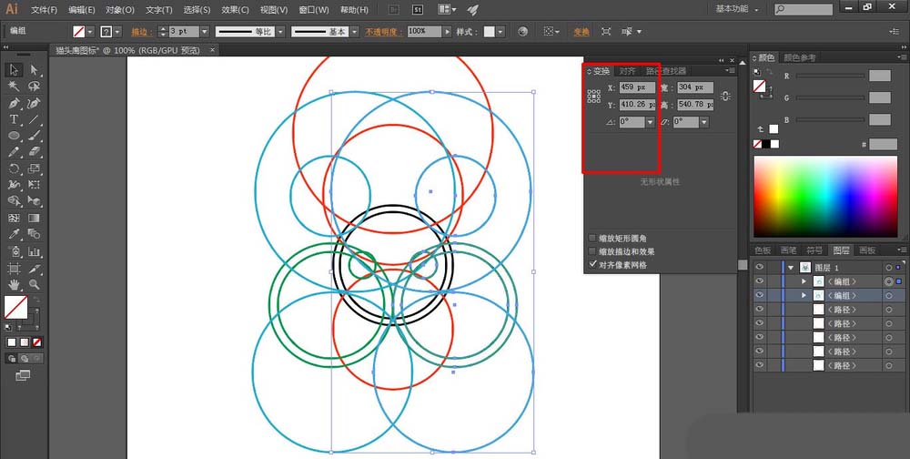 39、修改右上角的变换面板,X:459px,Y:410.26px,数值要精确,不然之后会很麻烦。