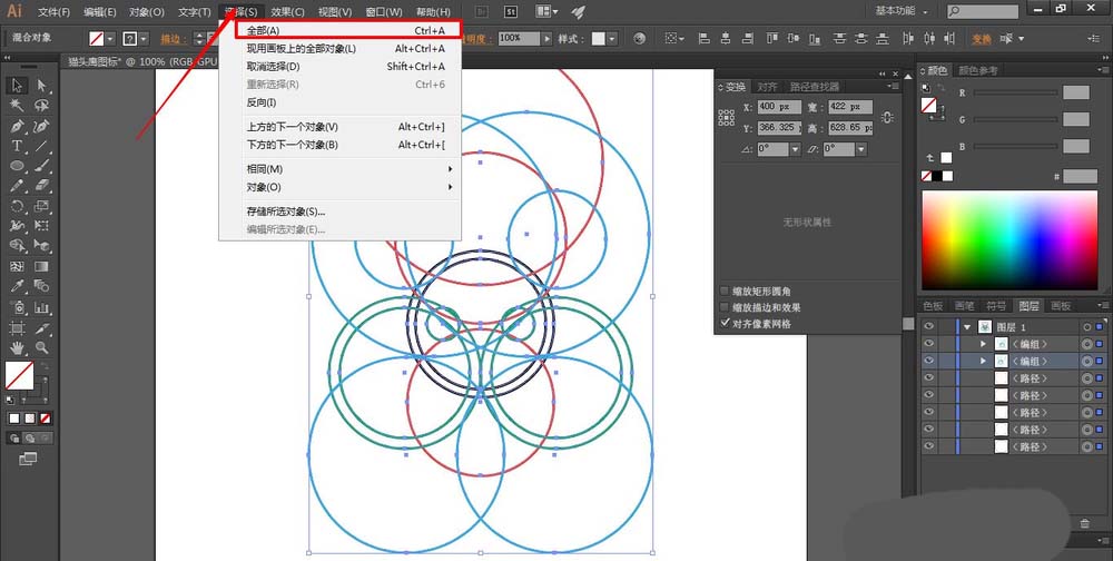 40、选择菜单栏的选择—全部(快捷键Ctrl+A),如图所示。