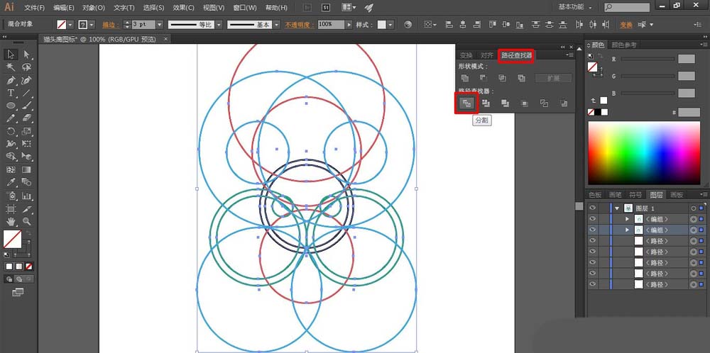 41、选择右上角的路径查找器面板,选择分割,如图所示。
