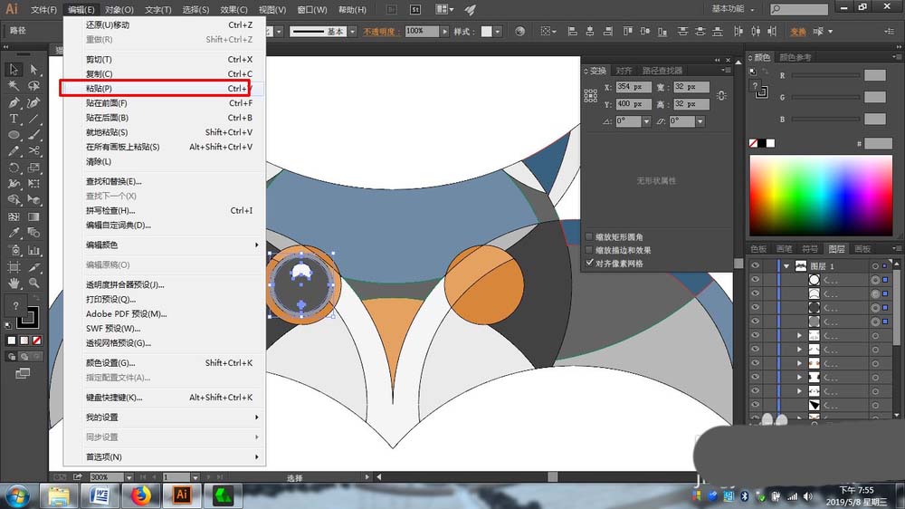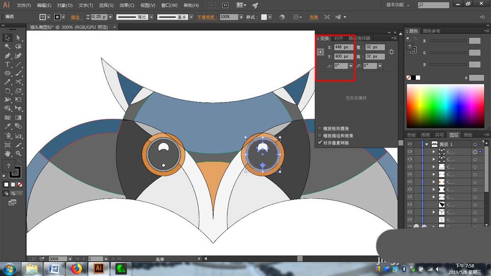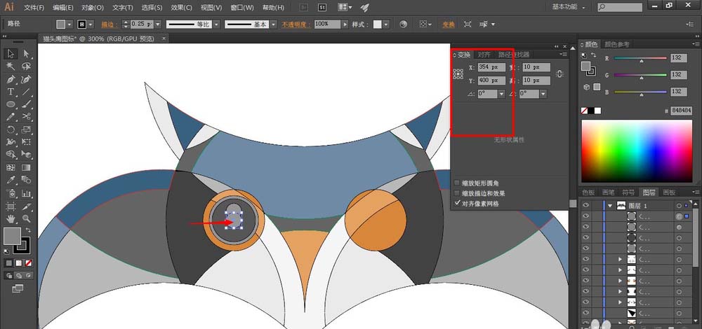 33、修改右上角的变换面板,X:306px,Y:296.3px,数值要精确,不然之后会很麻烦。