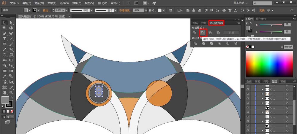 53、按住Shift键选中两个小圆,选择路径查找器的减去顶层,如图所示。