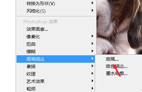 5、在效果菜单里选择画笔描边-喷溅,如图。