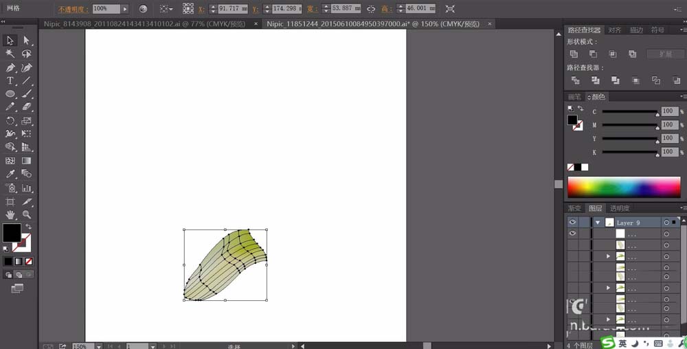 6、这一步,我们再来画一画花朵后方的叶片的路径,我们用网格工具做好路径,用暗绿色的渐变进行填充。