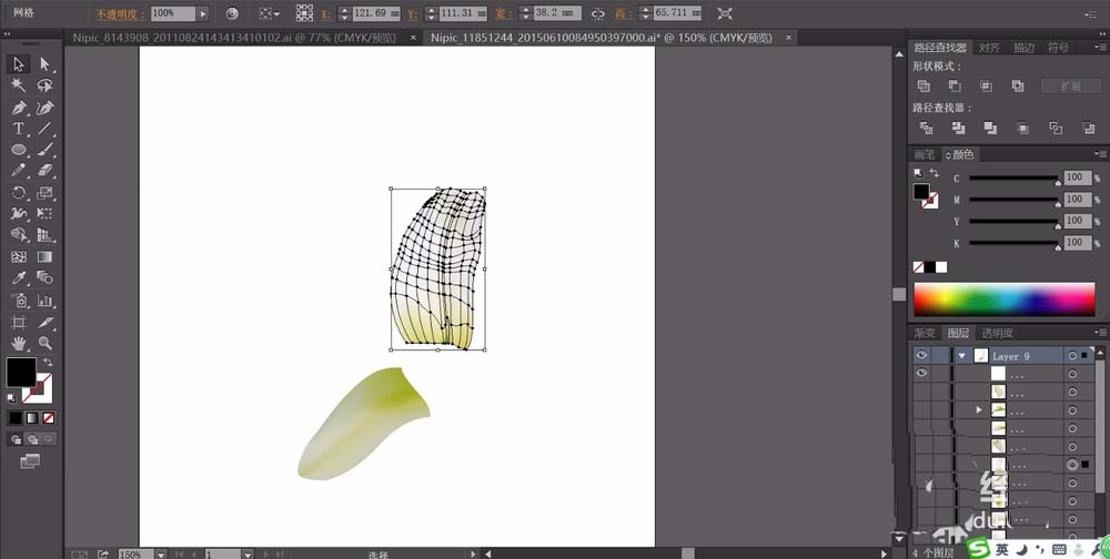 5、继续画出右侧的最后一片花瓣,用同样的方法进行路径的绘制与色彩的填充。接着,我们再用钢笔画出茉莉花的花蕊,我们也是用网格工具进行路径的分解再填充一个淡绿色的渐变。