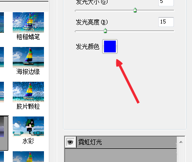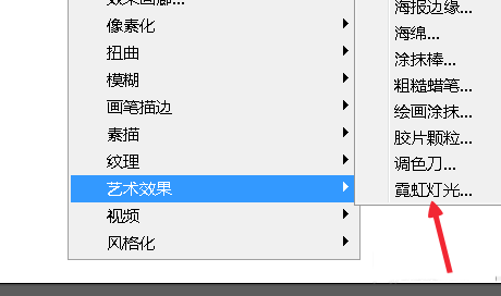 3、选择照片,然后在菜单里找到效果-艺术效果-霓虹灯光,如图。