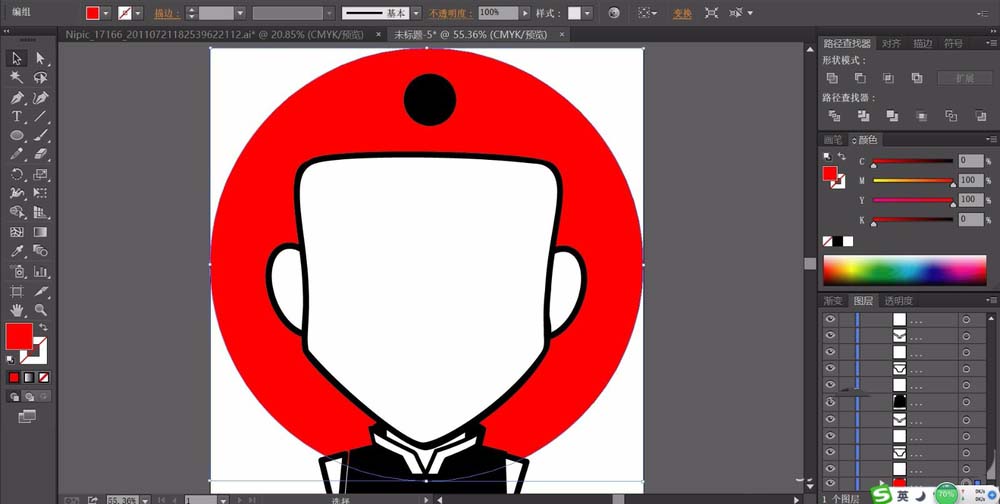 3、继续用圆形画出头像的背景并填充一个暗红色,我们再继续画出领口的细节,还有老夫子的头顶的帽子的路径。