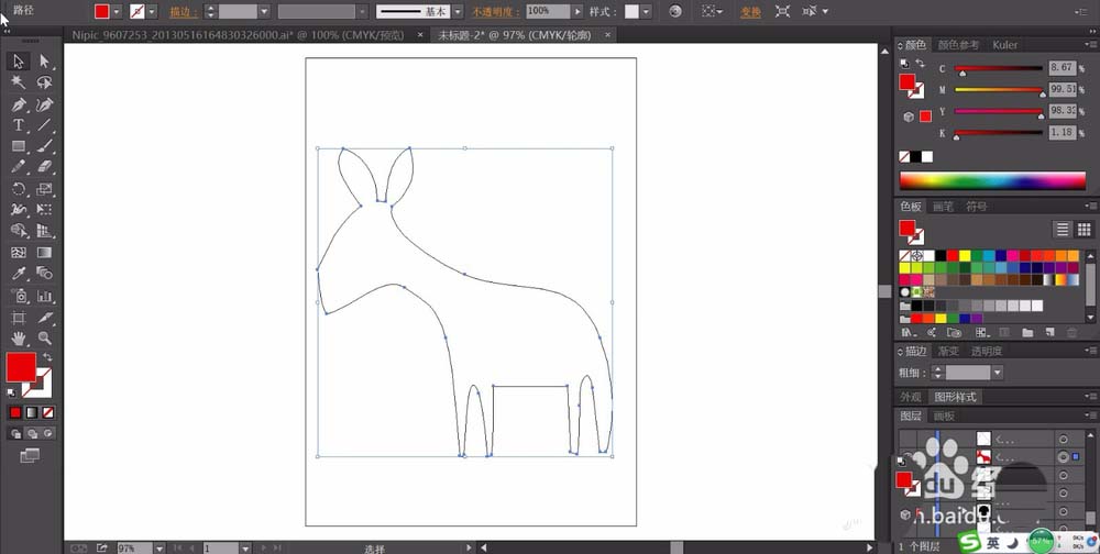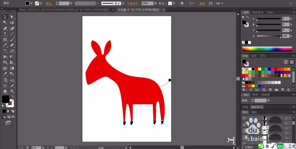 2、用红色填充整个驴子的身体路径,再画出驴子的脚与尾巴的细节路径。