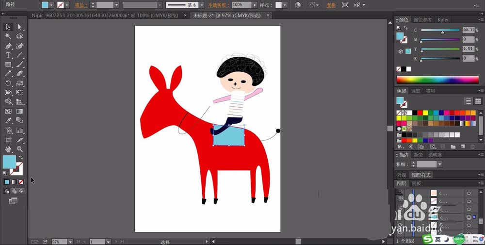 5、用天蓝色填充驴子的背上的坐垫的路径,用粉色与白色填充小孩的衣服路径。