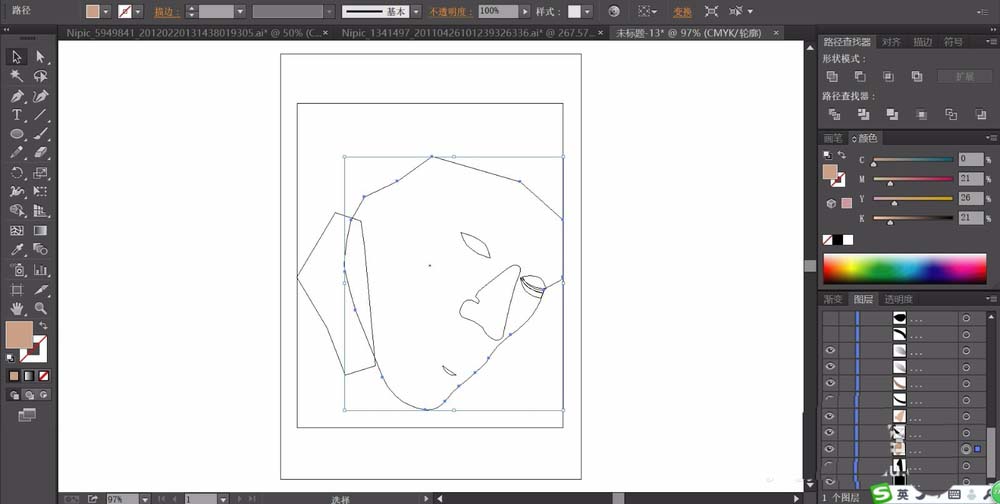 2、继续画出人物的眼晴结构,分为眉毛、眼珠、眼帘等元素的路径,接着,再画出鼻子的轮廓。