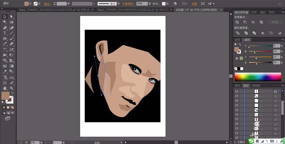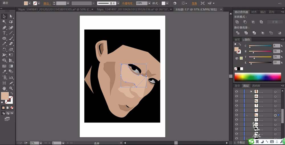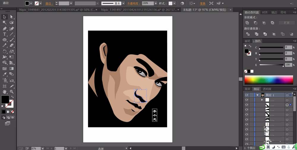 7、最后,我们继续来画出眼晴的细节元素路径,还有鼻子的暗光路径,分别用黑色与白色搭配填充,从而完整的再现影星的面貌,影星头像设计完成。