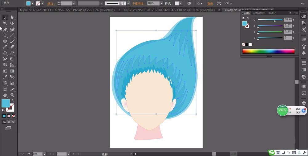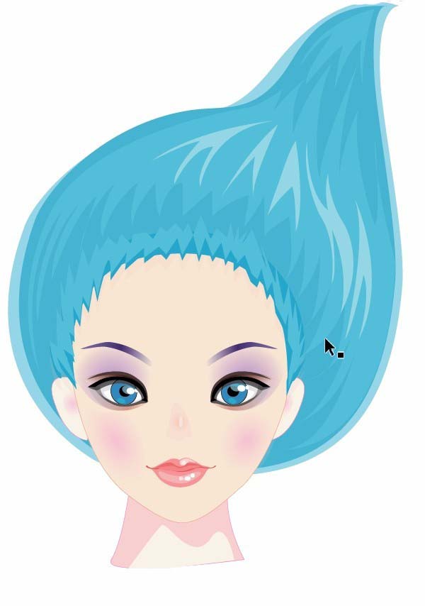 3、使用钢笔画出女孩的头发的层次细节,我们用天蓝色填充不同的层次,让头发可以从深到浅的进行变化。
