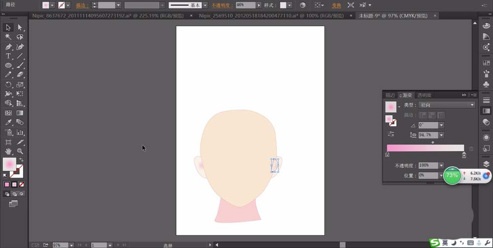 2、继续画出女孩的耳朵的细节路径,我们用粉色的渐变填充耳朵的细节结构。
