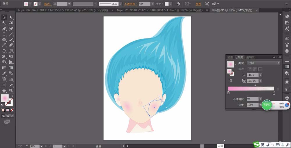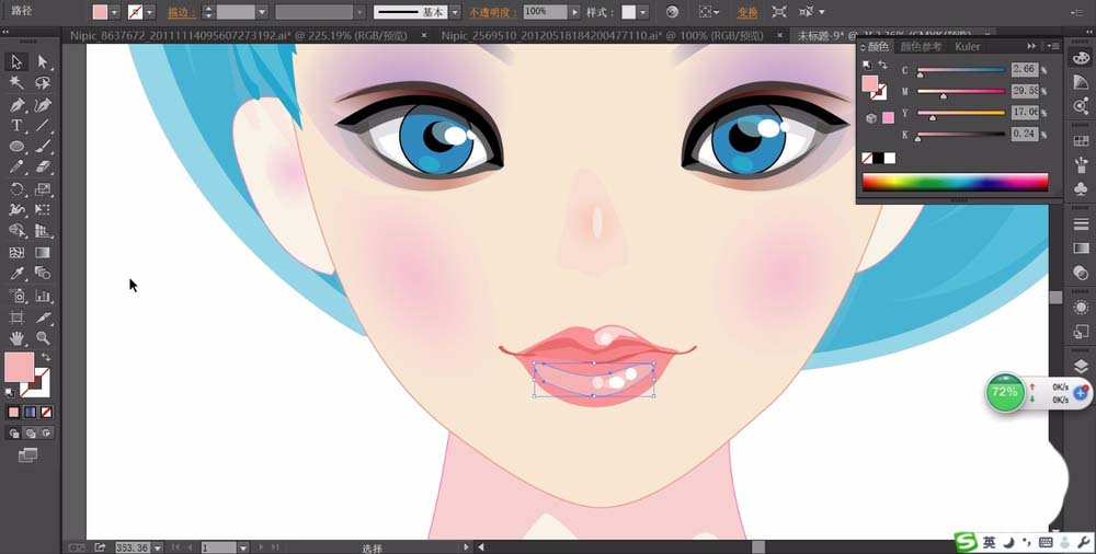 7、接着,我们开发绘制嘴唇的路径,用粉色、粉红色 、灰粉色来填充嘴唇的暗色、过渡层、高光区域的路径,完成蓝发女孩图片设计。