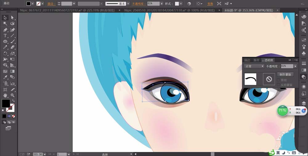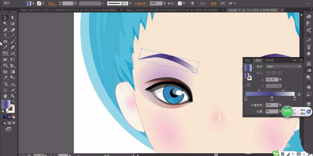 5、继续画出女孩的眼晴及周围的元素的路径,眉毛用半透明的灰黑色渐变填充,眼晴用绿色与黑色搭配填充。