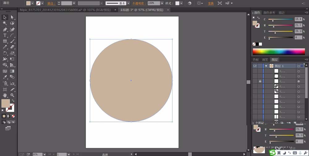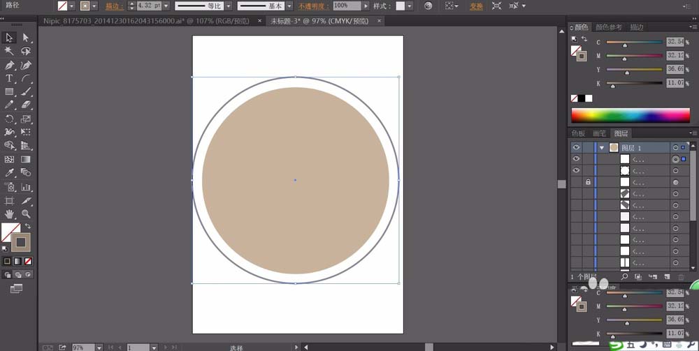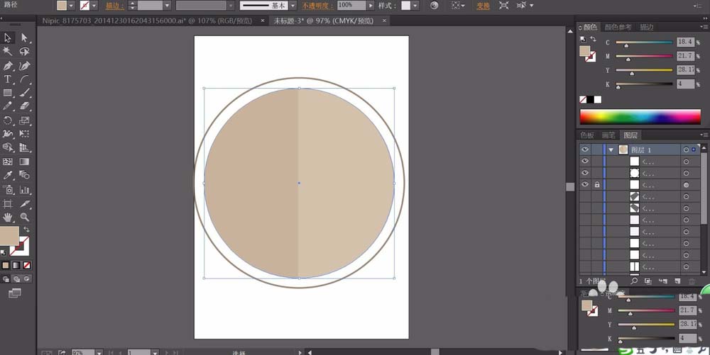 3、我们使用钢笔画同一个半圆形的路径在圆的右侧,我们用较亮的棕灰色进行填充。