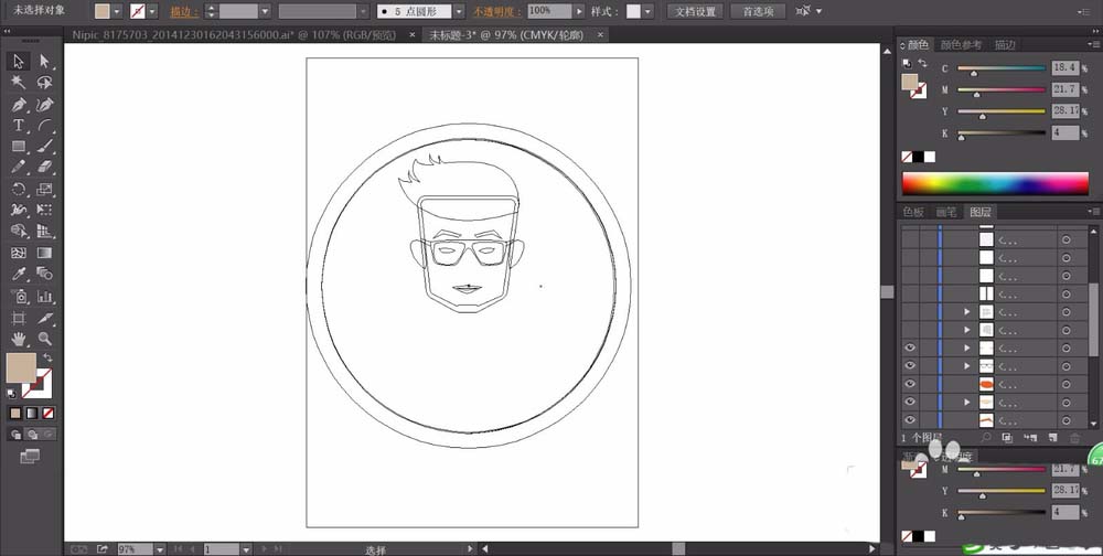 4、继续画出圆形路径上面的人的脸蛋轮廓路径,把人的表情元素也一一用钢笔绘制出来。