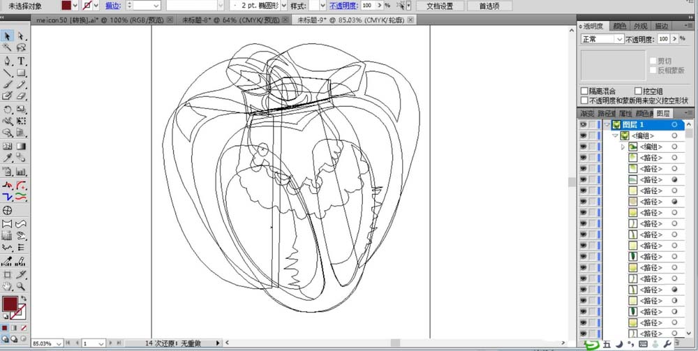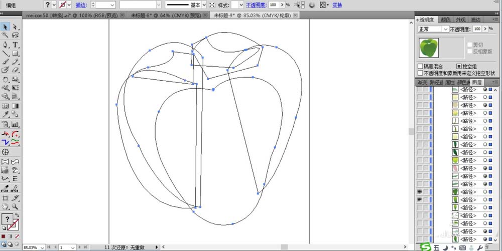 2、我们继续来画出菜椒的切口路径,还有表面上的结头,表面上的光线路径。