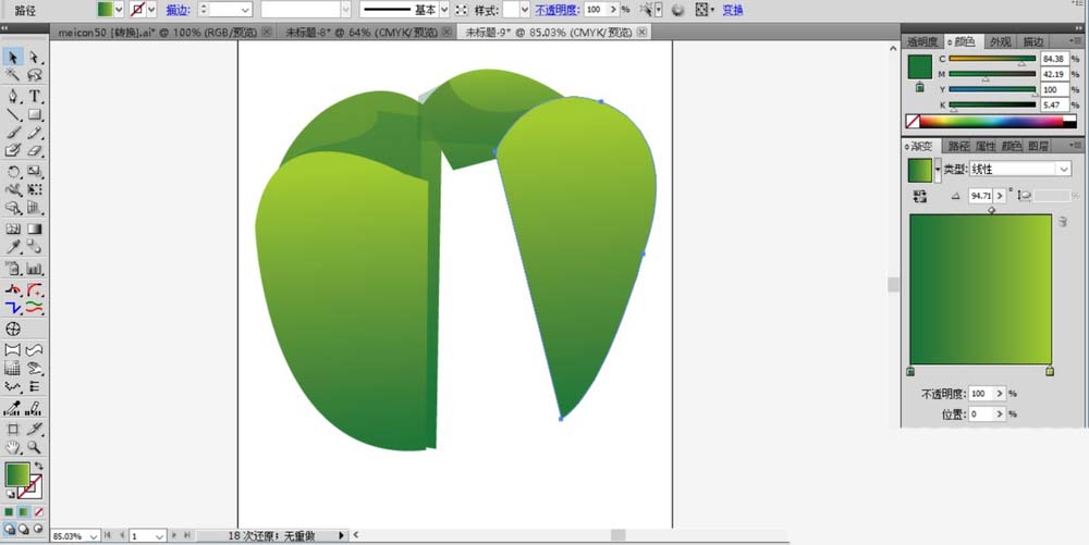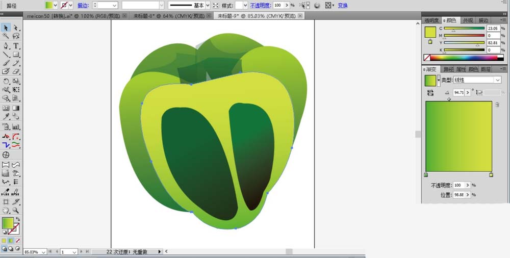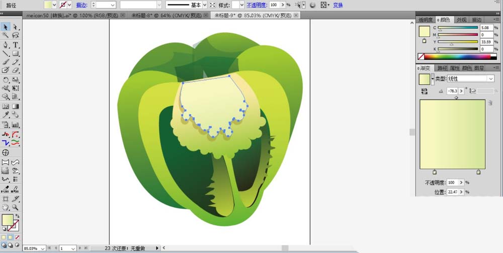 4、用不同明度的绿色渐变分别填充菜椒的几个不同圆弧截面。