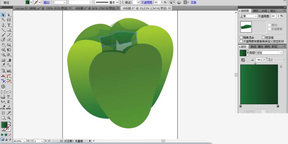 5、用深绿色的渐变填充菜椒的正面切口路径,用半透明的绿色填充菜椒的顶端的结头的底部。