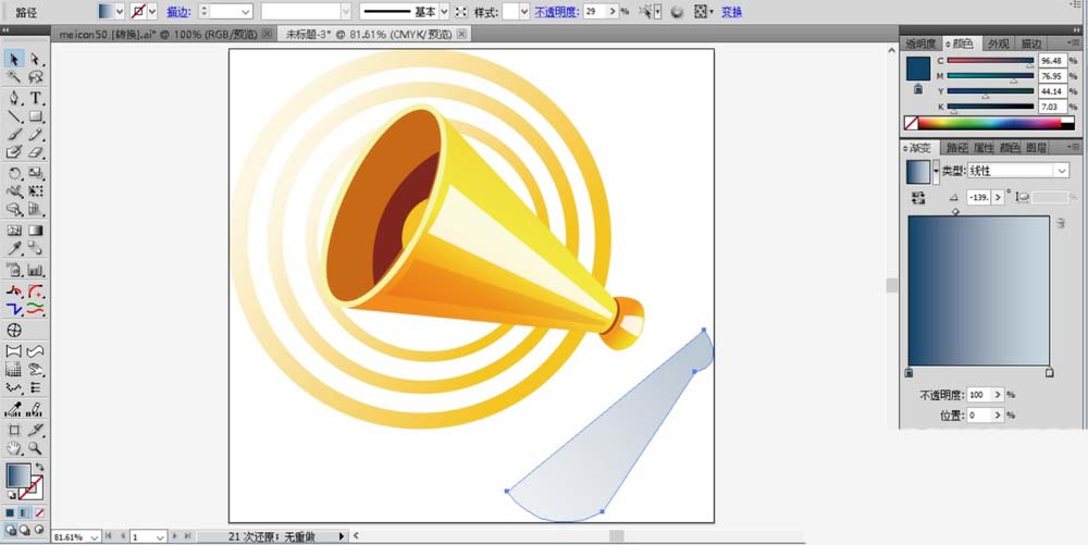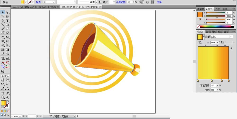 5、我们继续用不同明度的橙色渐变填充大喇叭的正面与内部,让高光出现在正面,让暗光出现在内部,用半透明的白色填充高光路径。