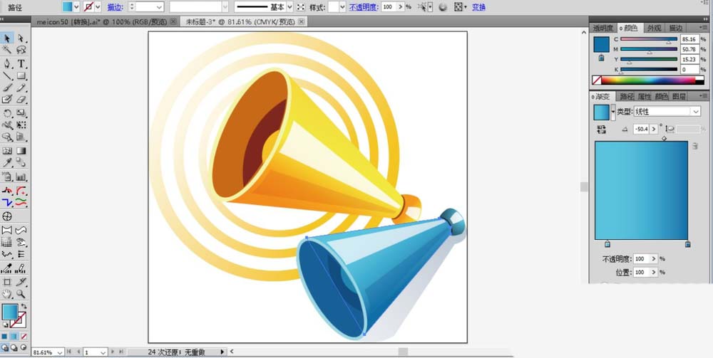 生活中我们经常能用到扬声器,也就是小喇叭,今天我们就来画一画橙色与蓝色的小喇叭,从中学习一下圆形工具的使用方法,学会灵活的使用圆形与钢笔工具,请看下文详细介绍。