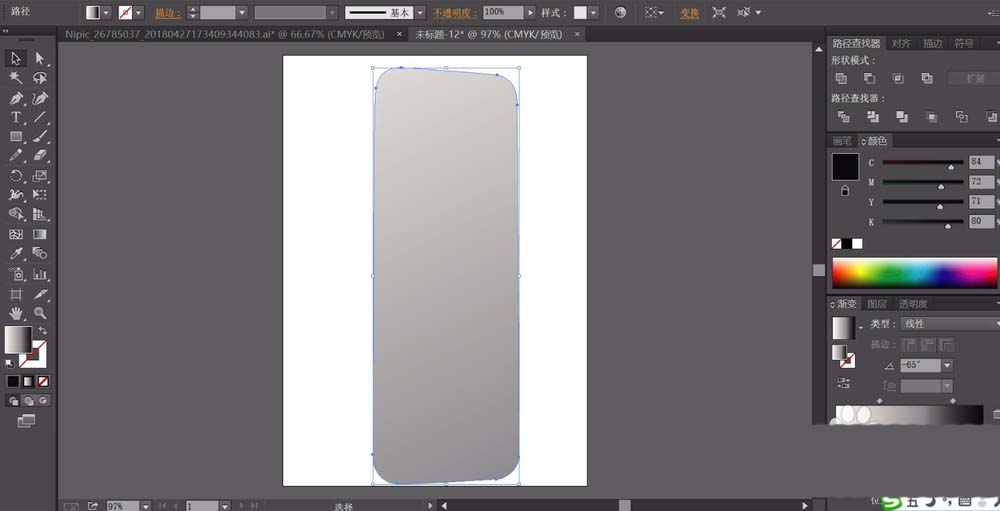 1、先选择圆角矩形工具,设置好角度,我们画出一个圆角的矩形作为音响的外表轮廓路径,我们填充一个灰色的渐变。