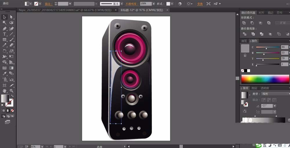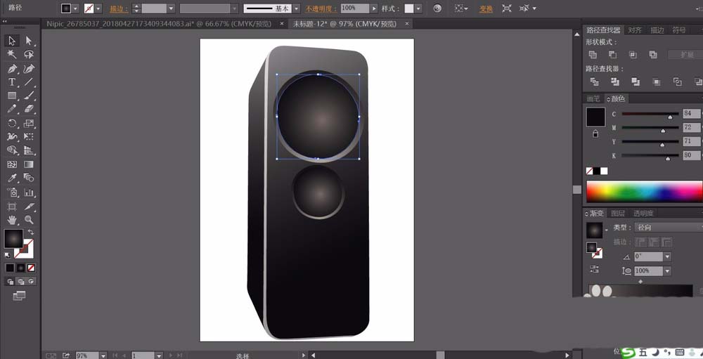 2、我们继续选择钢笔工具画出音响的左侧面的路径,复制正面的路径并缩小到95%左右,我们填充一个灰黑色的渐变,左侧面的路径也用一样的灰黑色的渐变填充,再使用圆形工具画出音响正面的两个圆形,填充一个灰色的径向渐变,再复制一下并缩小到80%填充一个灰黑色的径向渐变。用同样的办法做出大圆形结构件下方的小的圆形结构件。